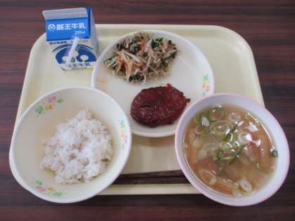 今日の給食の献立は、麦ご飯、牛乳、ハンバーグ、三色おひたし、大根のみそ汁です。