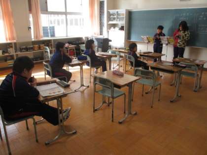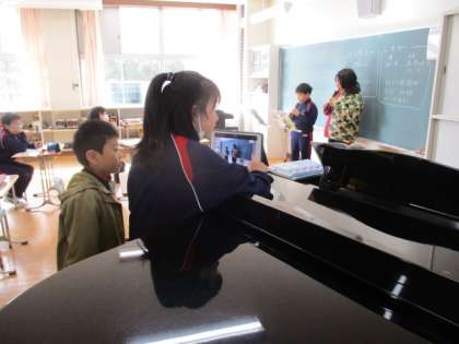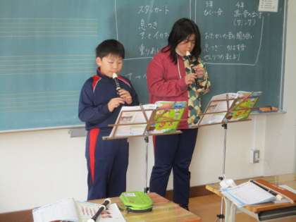 3・4年生の音楽です。2人組になってリコーダーの発表を行いました。
