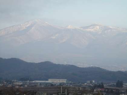校舎の背景に朝日を浴びた安達太良連峰が見えました。