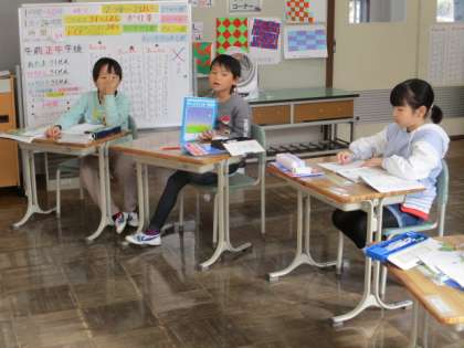 2年生の算数です。「みかんが1袋に3個入っています。この袋を4個買いました。みかんは全部でいくつになりますか?」自分たちで問題をつくって、みんなで考えました。
