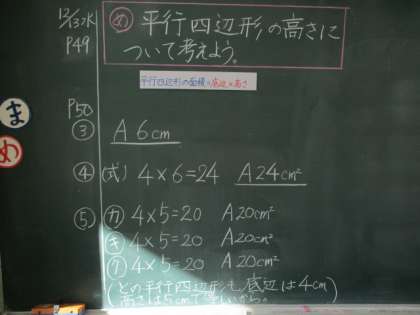 5年生の算数です。ノートに平行四辺形の図を大きくかいて、計算しています。