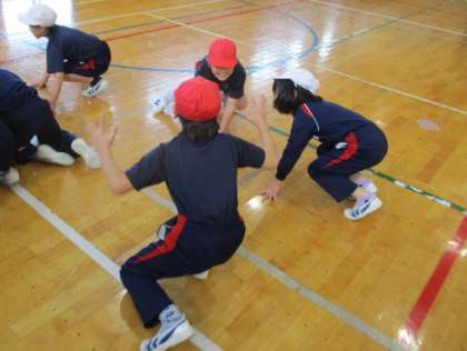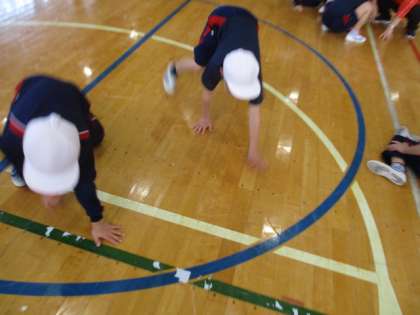 1・2年生の体育です。動物の鳴き声を聞いて、その動物になりきって動き回りました。始めはライオン、次はヒヨコです。とても盛り上がりました。