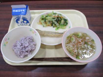 今日の給食の献立は、ゆかりごはん、牛乳、ししゃもの天ぷら、からしあえ、すまし汁です。