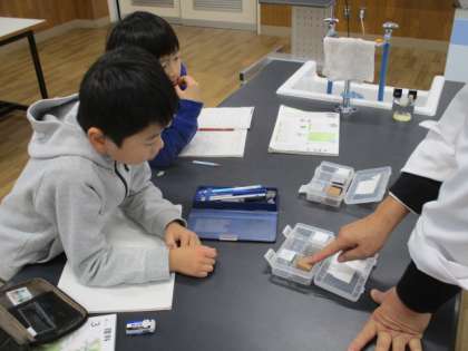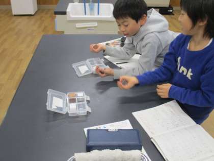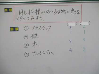 3年生の理科の授業です。同じ体積の物体の重さについて、重い順に予想した後、手で持って確かめ重さを計りました。