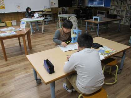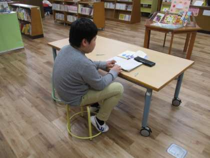 本日の授業の様子をお届けします。4年生の国語です。図書室で詩について調べています。