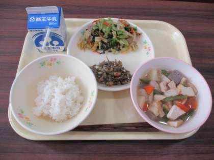 今日の給食の献立は、ごはん、牛乳、野菜のうま煮、おかか入りおひたし、大豆と小魚の佃煮です。