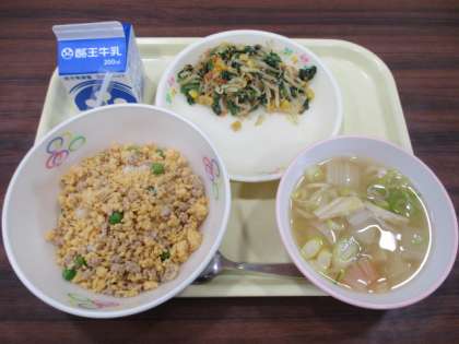 今日の給食の献立は、そぼろごはん、牛乳、ほうれん草ともやしのごまあえ、白菜のみそ汁です。
