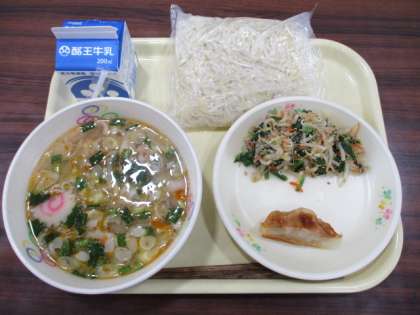 今日の給食は、からしみそタンメン、牛乳、ナムル、ギョウザです。今日も大変おいしいかったです。