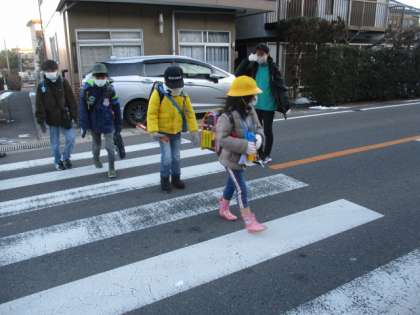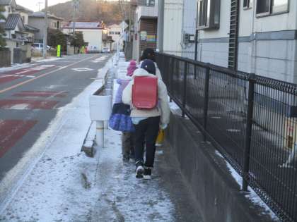 朝の登校の様子です。歩道には昨日の雪がまだ残っていました。今朝も子どもたちは元気に登校していました。