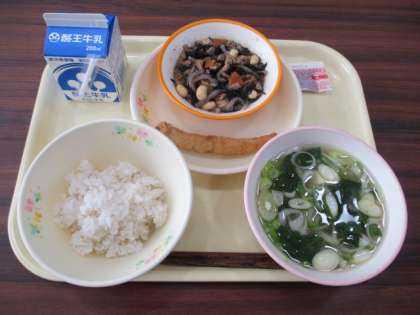 今日の給食の献立は、麦ごはん、牛乳、ひじきの煮物、ししゃもフライ、小松菜とじゃが芋のみそ汁です。