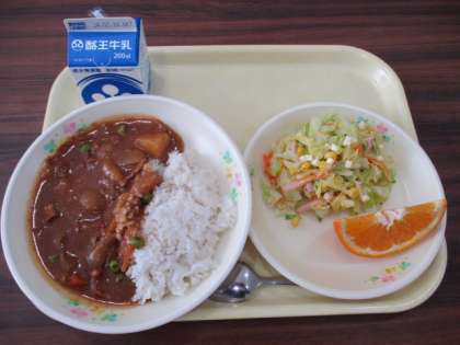 今日の給食の献立は、ハヤシライス、牛乳、コーンサラダ、いよかんです。