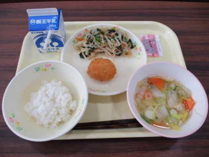 今日の献立は、ごはん、牛乳、おひたし、かにクリームコロッケ、白菜のみそ汁です。