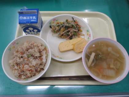 今日の給食の献立は、五目ごはん、牛乳、厚焼き玉子、小松菜のおひたし、冬野菜のみそ汁です。