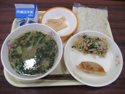 今日は6年生のリクエスト給食第1弾です。献立は、みそラーメン、牛乳、ぎょうざ、ナムル、おたのしみデザートです。