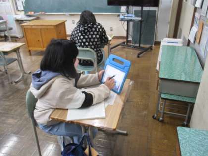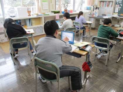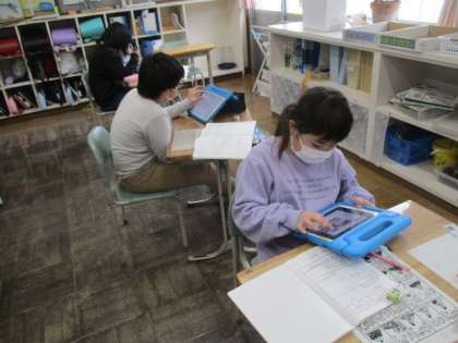 4年生の社会です。福島県内の市町村について調べ、発表の準備をしています。