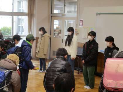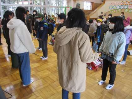 登校班子ども会を行い、新しい班長に班旗を引き継ぎました。班長の皆さん、1年間ありがとうございました。新しい班長の皆さん、よろしくお願いします。