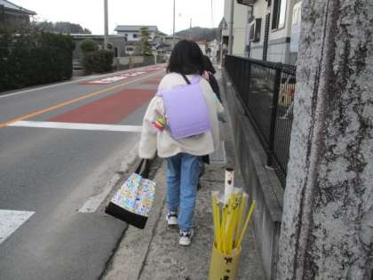 今朝の登校の様子です。登校の時間は曇っていました。新しい班長さんが班旗を持って先頭で歩いています。
