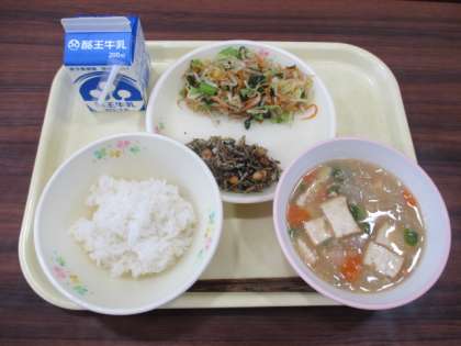 今日の給食の献立は、ごはん、生揚げの肉みそ煮、大豆と魚のつくだ煮、小松菜のおひたしです。