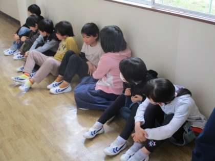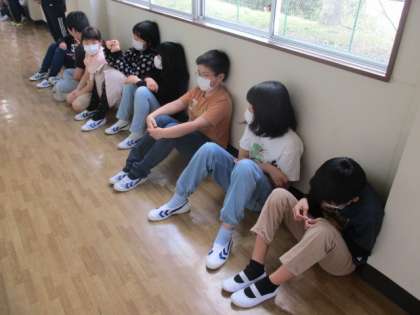 耳鼻科検診を保健室で行いました。話をしないで廊下に静かに並んでいます。