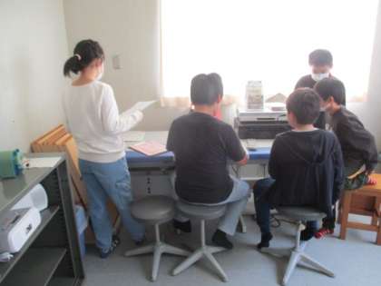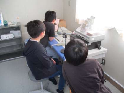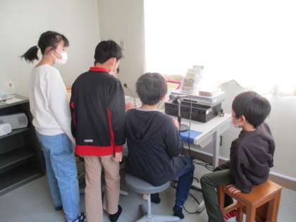情報わくわく委員会の皆さん全員が放送室に集まり、朝の放送を行っています。放送器機の操作方法等をみんなで確認しました。
