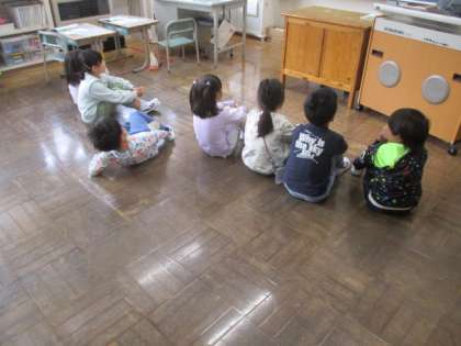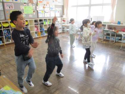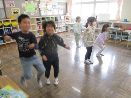 1・2年生の音楽です。音楽に合わせて体を動かし、ポーズを決めました。