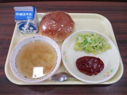 今日の給食の献立は、バンズパン、牛乳、ハンバーグ、ボイルキャベツ、コンソメスープです。
