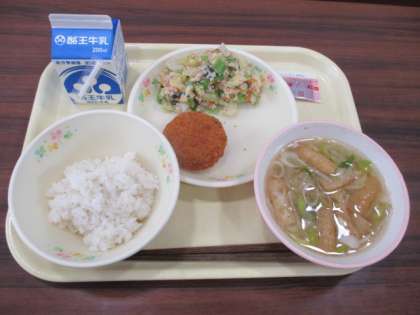 今日の給食の献立は、麦ごはん、メンチカツ、和風サラダ、油揚げのみそ汁です。今日も大変おいしかったです。