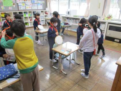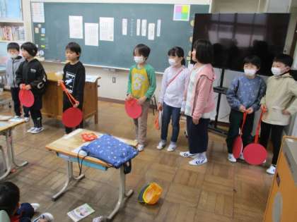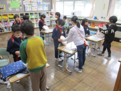 3・4年生の皆さんが1・2年教室を訪問し、1年生の皆さんにプレゼントを渡しました。首にかけたお皿は、3・4年生の皆さんが手作りしたもので、メッセージが記入されています。
