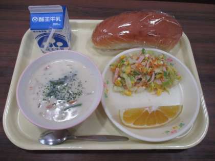 今日の給食の献立は、コッペパン、牛乳、クラムチャウダー、キャベツサラダ、ジューシーフルーツです。