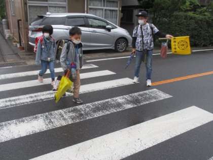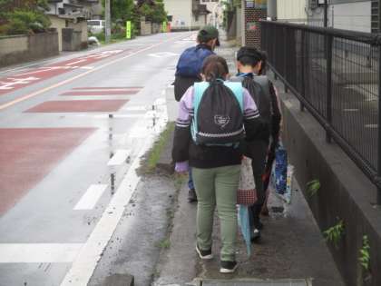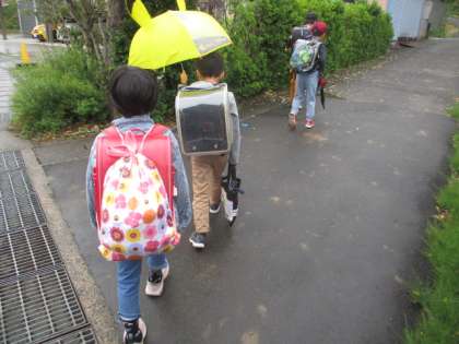 学校に近づくと小雨が降り出したので、傘をさして登校する様子が見られました。