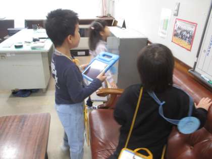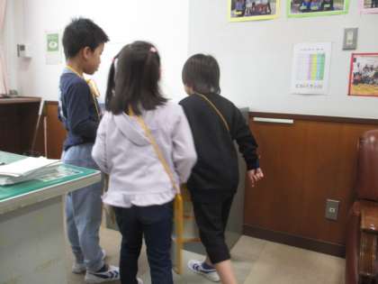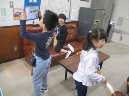 校長室では、耐火書庫や書棚等を珍しそうに見ていました。ソファーにも座りました。