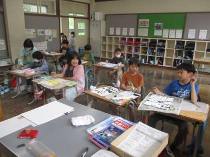 3・4年生の図工です。学校探険をしている1・2年生が、廊下から授業の様子を見ています。