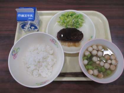 今日の給食は、運動会応援献立です。メニューは、ごはん、牛乳、ソースカツ、ボイルキャベツ、麩のみそ汁です。
