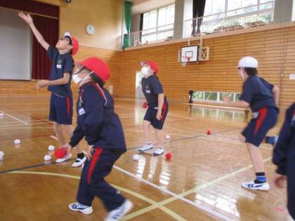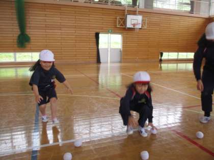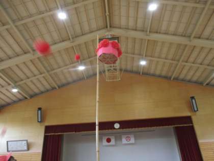 玉入れはかごの高さが少し高いためか、簡単には入らないようです。