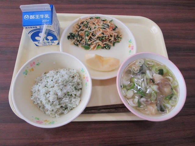 今日の給食の献立は、菜めし、牛乳、ほうれん草と玉子のごまあえ、石狩汁、りんごです。
