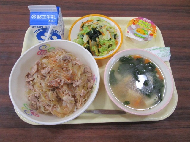 今日の給食の献立は、肉丼、牛乳、浅漬け、里芋のみそ汁、はちみつゆずゼリーです。