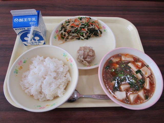 今日の給食の献立は、麦ごはん、牛乳、ナムル、シュウマイ、麻婆豆腐です。