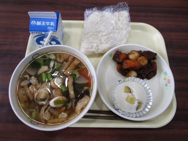 今日の給食の献立は、沢煮うどん、牛乳、白玉入り冬至かぼちゃ、さつまいも蒸しパンです。