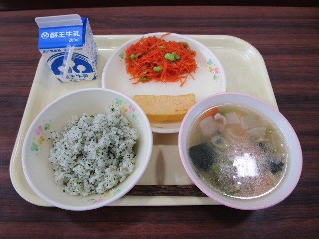 今日の給食は、鏡開き献立です。メニューは、菜めし、牛乳、厚焼き玉子、いか人参、白玉ぞうにです。