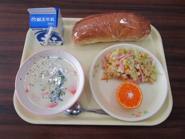 今日の給食の献立は、コッペパン、牛乳、ホワイトシチュー、野菜サラダ、みかんです。