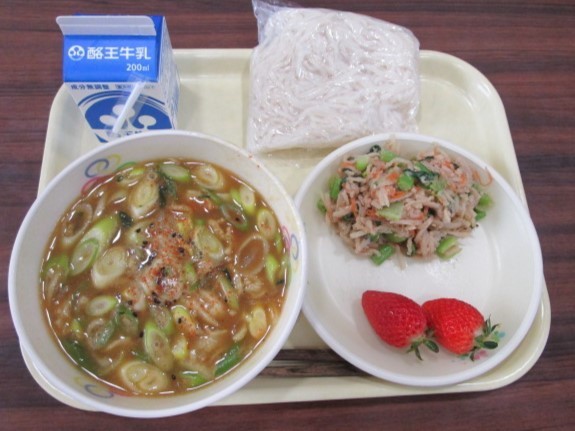 今日の給食の献立は、カレーうどん、牛乳、切干大根とツナのあえもの、いちごです。
