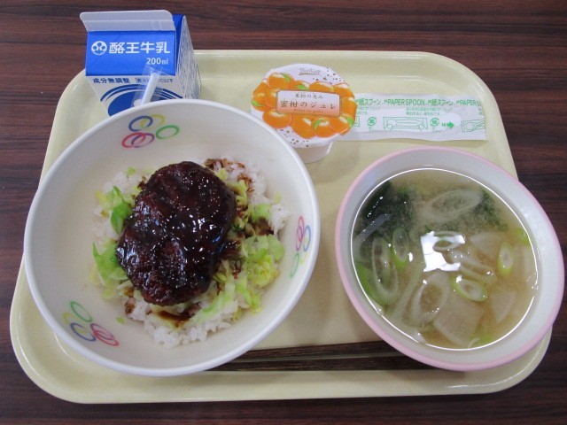 今日の給食は、食育の日献立です。メニューは、ソースカツ丼、牛乳、ボイルキャベツ、だいこんのみそ汁、オレンジジュレです。