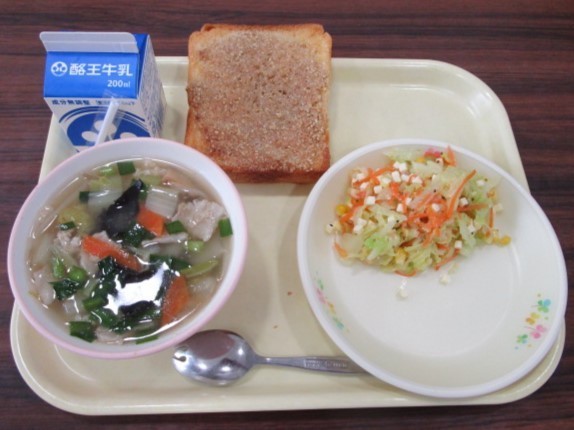 今日の給食の献立は、セサミトースト、牛乳、チーズサラダ、ごますいとんです。