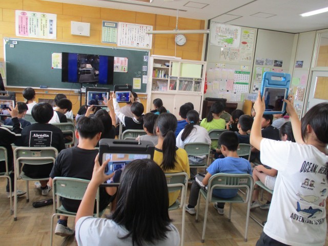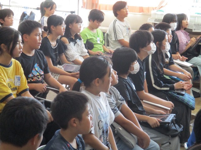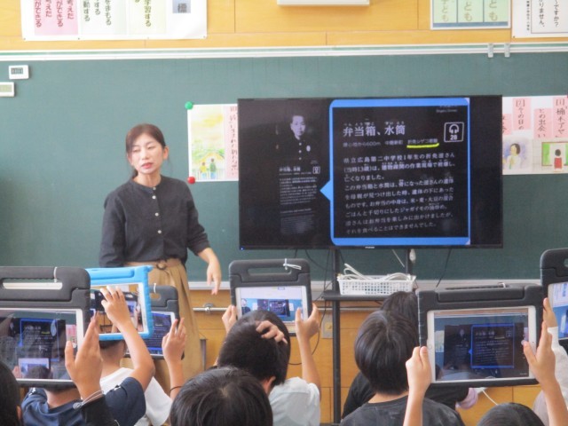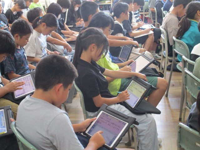 子どもたちは、先生の話をタブレットに記録しながら聞きました。