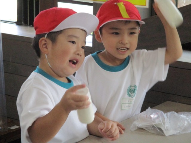牛乳が入った瓶を一生懸命振ってバターを作ります。