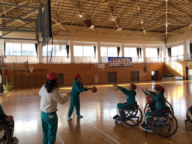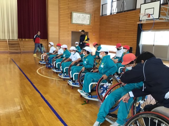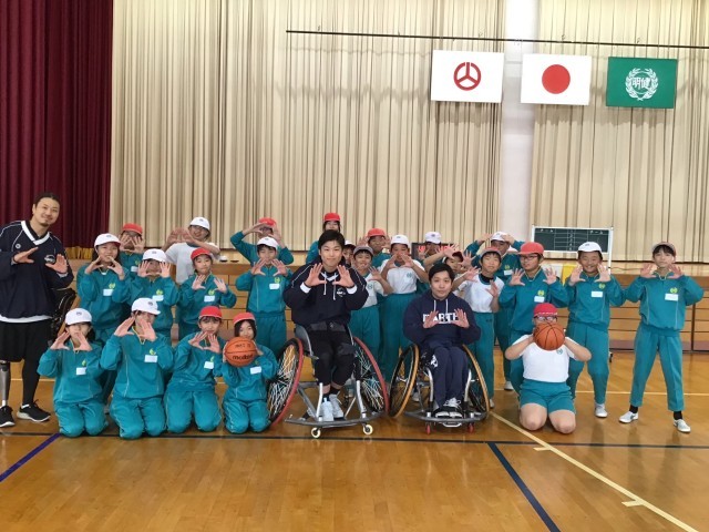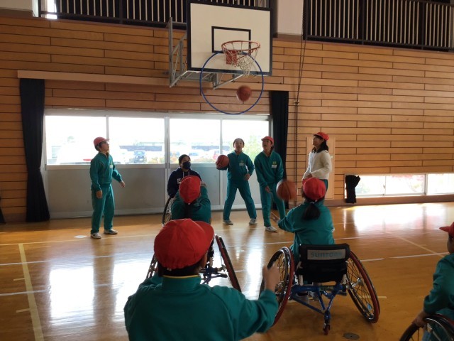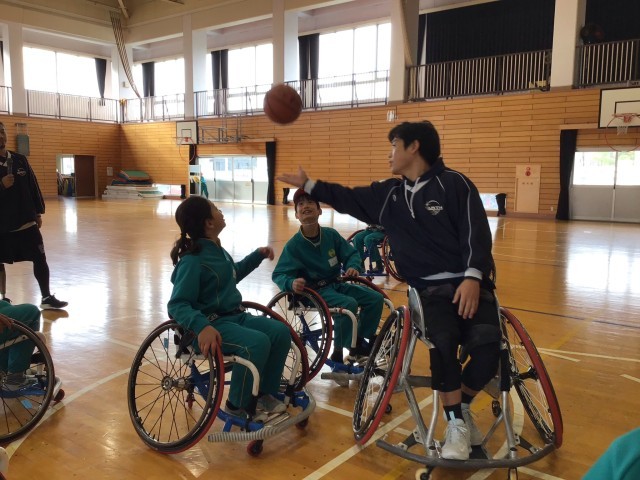 19日(水)、「する・みる・支える・知る」スポーツ教育の一環として、車いすバスケットボールチーム「TEAM EARTH」の選手3名をお招きして、車いすバスケの体験をしました。