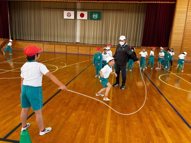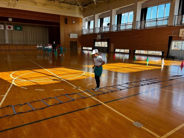 ミニハードルやラダーをピョンピョンとびます。最後には大なわにチャレンジ。なわとび大会にむけて上手にとべるようにがんばろう!