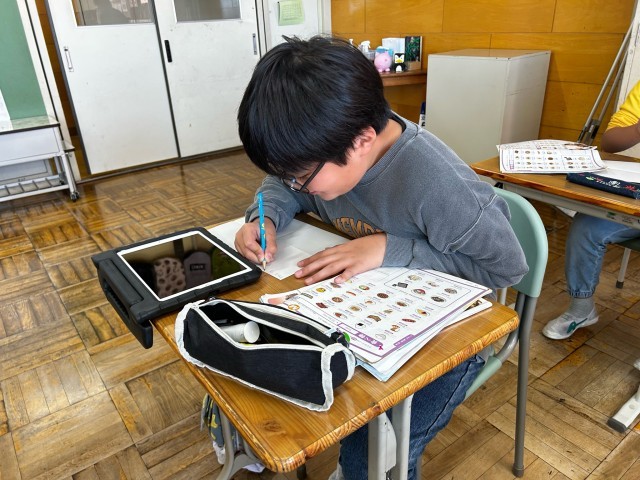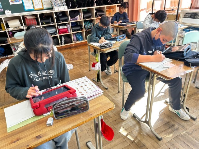 「これ英語でどう書くんだろう」6年生の子どもたちはタブレットや教科書で調べて書いていきました。英語で上手に伝えられたかな。