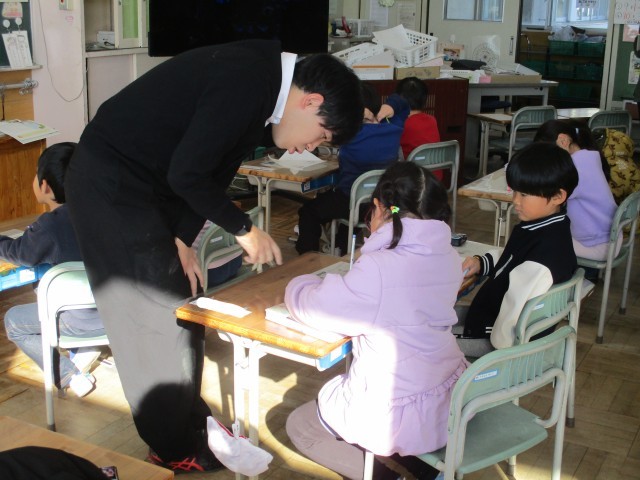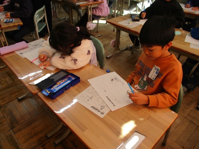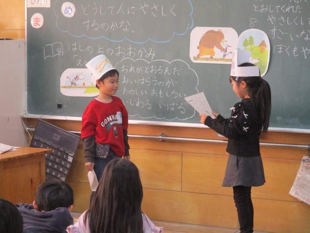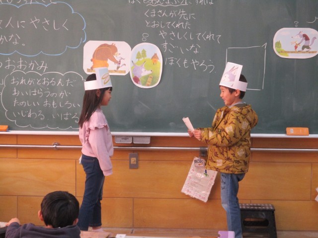 クマに優しくしてもらったオオカミの気持ちの変化に気づく子どもたち。