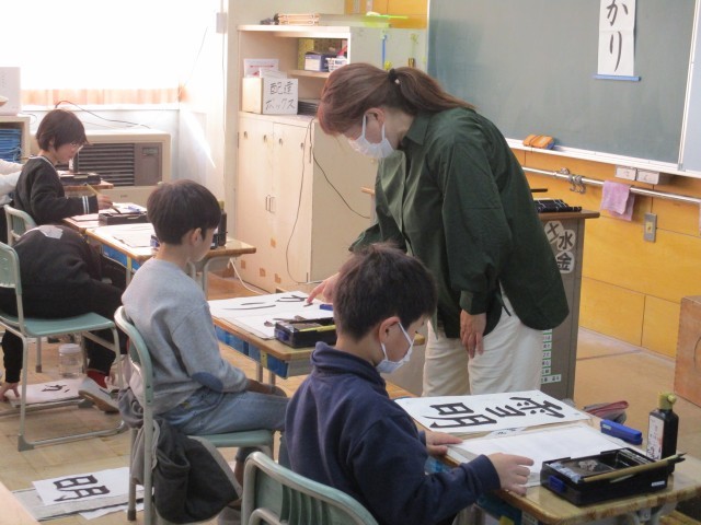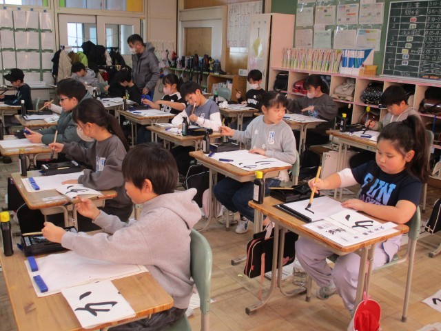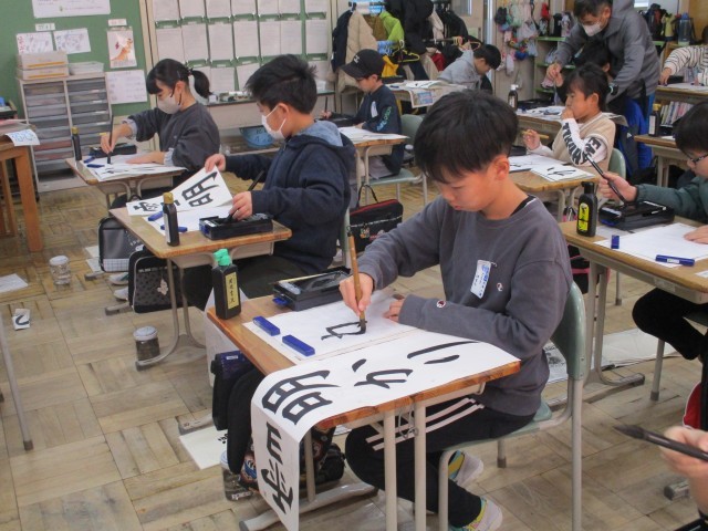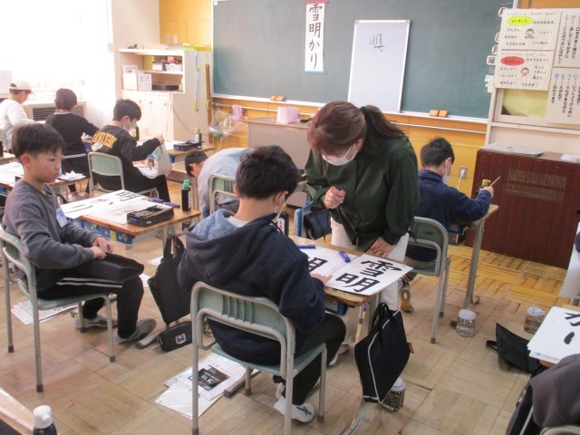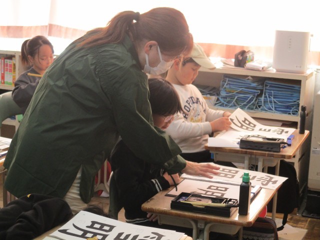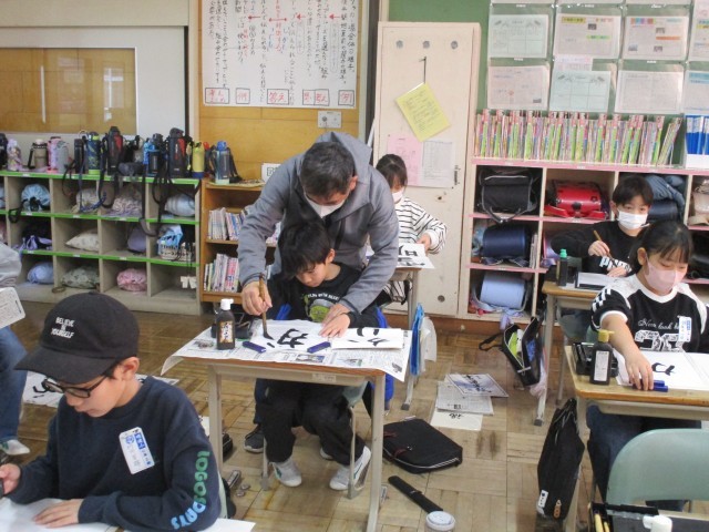 4年生は地域でお習字を教えている渋谷さんをお招きして書き初めの練習です。